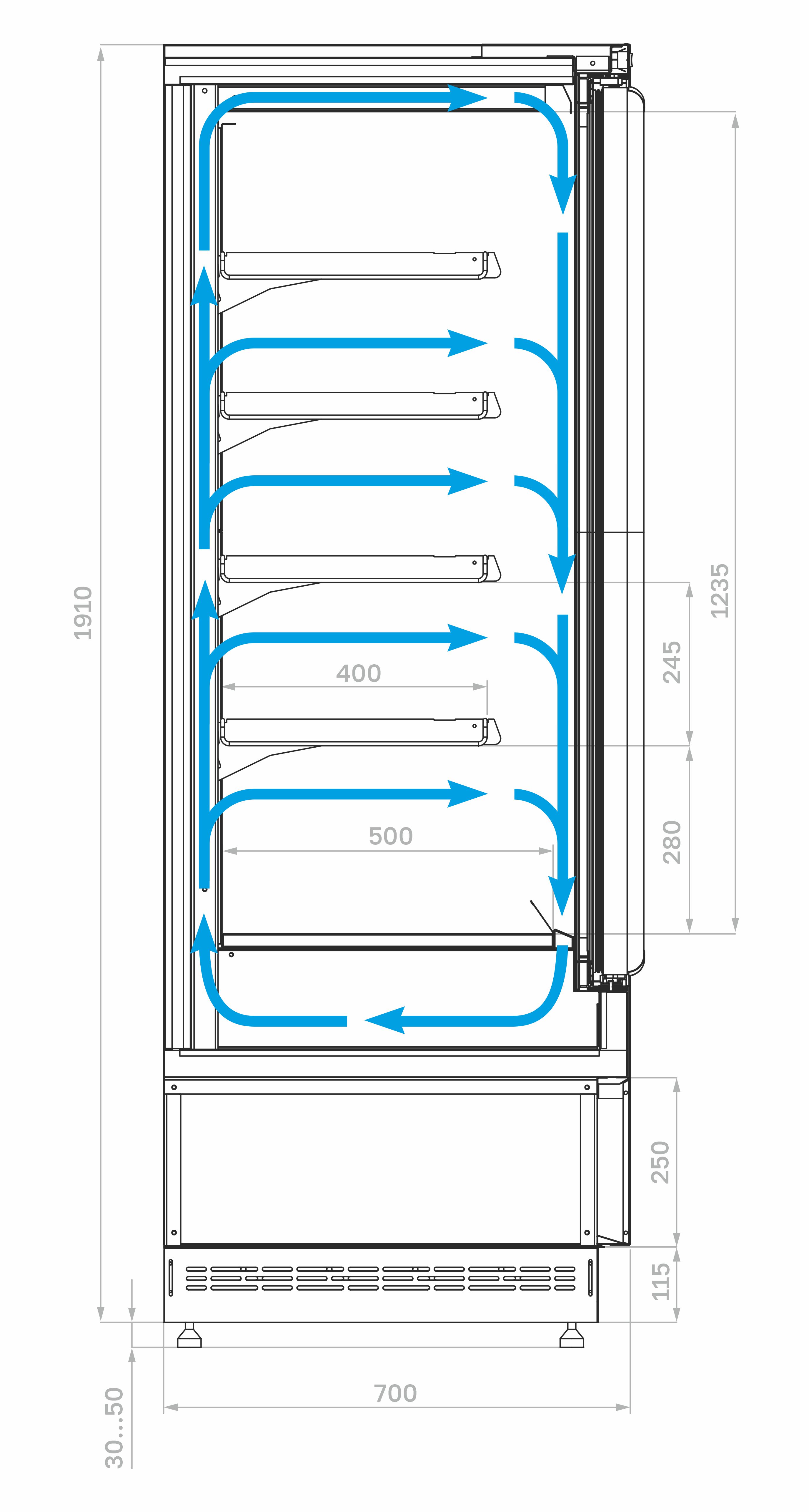 Модель оборудована четырьмя рядами навесных решетчатых полок с ограничителями, двумя распашными дверями с рукоятками по всей длине створок, глухими боковинами и подставкой с фронтальной термовыводящей и цокольной решётками. Корпус прямоугольной формы изготовлен из стали с антикоррозийным покрытием: внешние панели и полки выполнены в сером цвете (RAL 9006), а цоколь и дверные рамы — в чёрном цвете (RAL 9005). В качестве теплоизоляции используется пенополиуретан.