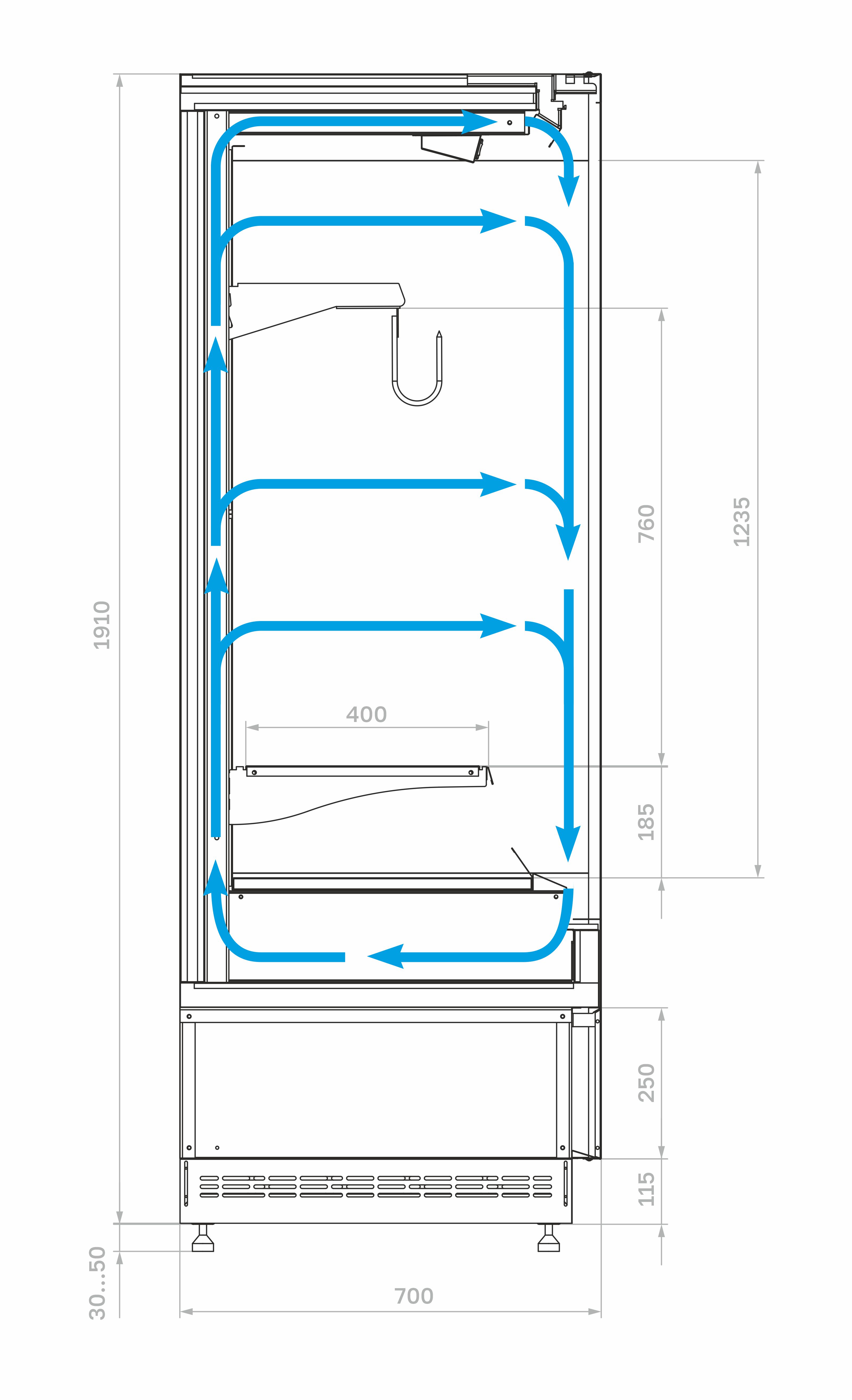 Модель оснащена навесной перфорированной полкой с кронштейнами, подвесом с крюками для мяса, распашной дверью с рукояткой по всей длине створки, а также подставкой с фронтальной термовыводящей и цокольной решётками. Корпус прямоугольной формы выполнен из стали с антикоррозийным покрытием внешних панелей и рам чёрного цвета (RAL 9005), внутренние панели — из нержавеющей стали (RAL 0430), теплоизоляция выполнена из пенополиуретана.