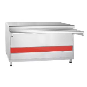 Рабочая поверхность выполнена из особо прочной нержавейки, способной выдерживать значительные нагрузки, что особенно важно при размещении тяжелых емкостей с напитками. В нижней части прилавка предусмотрен встроенный шкаф с распашными дверцами, в котором удобно хранить посуду и инвентарь, используемые в процессе работы.
