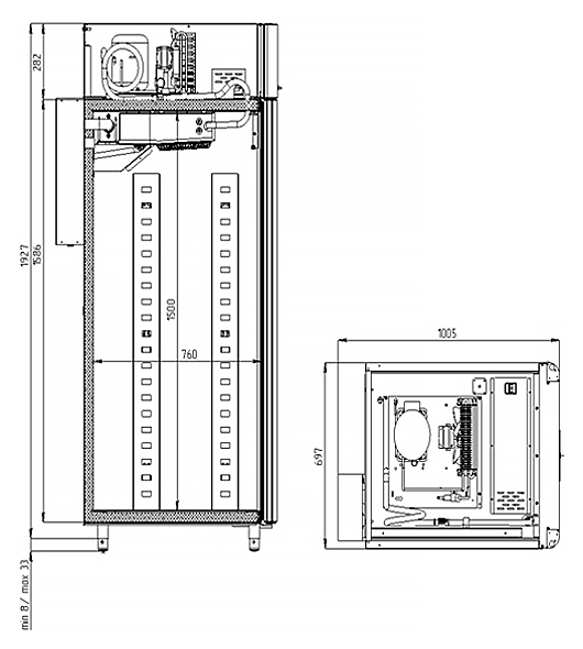 Каталог оборудования Холодильное оборудованиеШкафы холодильныеСпециализированные холодильные шкафыШкаф холодильный для хлебопекарных производств Polair CS107-Bakery Br со стеклом (Тип 2) Шкаф холодильный для хлебопекарных производств Polair CS107-Bakery Br со стеклом (Тип 2) Код товара: 062-623 Поделиться: WhatsAppTelegram СравнитьДобавить в КПВ избранное 0 419 900 ₽ В корзину 0 шт Под заказСамовывоз сегодня бесплатно Взять в кредит Купить в лизинг Получить консультацию в WhatsApp Описание Характеристики Отзывы 0 Инструкции 5 Шкаф холодильный для хлебопекарных производств Polair CS107-Bakery Br со стеклом (Тип 2) предназначен для создания оптимальных условий хранения и расстойки заготовок из теста на предприятиях общественного питания и торговли. Корпус цельнозаливной, выполнен из нержавеющей стали, дверь — стеклопакет. Оборудование стабильно работает при температуре окружающей среды до +40 °C. В комплект входят 20 пар направляющих размером 400×600 мм. Особенности: Многофункциональные режимы: охлаждение тестовых заготовок, замедление ферментации, хранение, регенерация, брожение и расстойка Динамическое охлаждение с мягким обдувом без заветривания и автоматическая оттайка с системой испарения конденсата Панель управления с 7" дисплеем: контроль температуры, влажности (регулируется от 60 до 95 %), скорости вентилятора и времени, возможность создания и сохранения собственных программ Встроенный ультразвуковой увлажнитель (требуется подключение к системе водоочистки и канализации) Эргономичная конструкция: верхнее расположение агрегата, распашная дверь со стеклопакетом и механизмом самозакрывания, педаль для удобного открытия, съёмные направляющие и легко заменяемый уплотнитель с магнитной вставкой Простота ухода: штампованное углубление в дне корпуса для сбора загрязнений Экологичный хладагент R290 Энергоэффективность: потребляемая мощность — 0,55 кВт (охлаждение), 0,9 кВт (нагрев) Толщина стенки корпуса — 43 мм Polair CS107-Bakery Br со стеклом (Тип 2) — современный шкаф отложенной расстойки, обеспечивающий полный контроль и гибкость при работе с тестовыми заготовками. Благодаря многофункциональным режимам, точной настройке параметров и продуманной конструкции, он становится надёжным решением для пекарен и кондитерских, стремящихся к высокому качеству продукции и удобству в эксплуатации.Изображение товара, представленного на фото, может отличаться от его фактического вида. Показать все Габаритные размеры697×1005×1960 ммДиапазон рабочей температурыот -10 до +40 °CДлина697 ммШирина1005 ммВысота1960 ммОбъём700 лКол-во дверей1 Тип двериСтеклянная Уровень влажностиот 60 до 95 %Направляющие под EN 40*6020 Расстояние между направляющими60 ммХолодильный агрегатВстроенный Тип оттайкиАвтоматическая Тип охлажденияДинамический ПодсветкаЕсть ХладагентR290 Вес нетто180 кгВес брутто205 кгБрендPolairВсе специализированные холодильные шкафы Из нержавейки Оставить отзыв Еще никто не оставил отзыв на этот товар Схема POLAIR CS107 Bakery Br.jpgИнструкция на POLAIR CS107 Bakery Br.pdfБрошюра на хлебопекарное оборудование POLAIR.pdfДекларация о соответствии.pdfСертификат соответствия.pdf Похожие товары Перейти в каталог Под заказ 397 800 ₽ Шкаф холодильный для вызревания сыра Polair CS107 Cheese полки нерж., со стеклом Под заказ 419 900 ₽ Шкаф холодильный для хлебопекарных производств Polair CS107-Bakery Br со стеклом (Тип 2) Под заказ 264 448 ₽ Шкаф холодильный дл