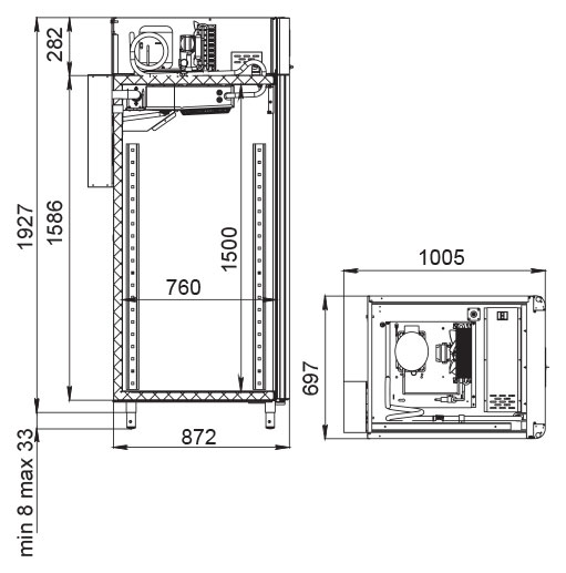 Каталог оборудования Холодильное оборудованиеШкафы холодильныеСпециализированные холодильные шкафыШкаф холодильный для вызревания салями Polair CS107 Salami Шкаф холодильный для вызревания салями Polair CS107 Salami Код товара: 009-391 Поделиться: WhatsAppTelegram СравнитьДобавить в КПВ избранное 0 390 915 ₽ В корзину 0 шт Под заказСамовывоз сегодня бесплатно Взять в кредит Купить в лизинг Получить консультацию в WhatsApp Описание Характеристики Отзывы 0 Инструкции 5 Шкаф холодильный для вызревания салями Polair CS107 Salami предназначен для приготовления и хранения салями, сыровяленых колбас и других мясных деликатесов на предприятиях общественного питания и торговли. Монолитный цельнозаливной корпус выполнен из нержавеющей стали снаружи и внутри (кроме задней стенки), что обеспечивает высокую прочность, устойчивость к коррозии и долгий срок службы. Оборудование рассчитано на работу при температуре окружающей среды до +40 °С. Особенности: Верхнее расположение агрегата Русифицированная многофункциональная панель управления с дисплеем диагональю 5" Возможность создания и сохранения индивидуальных программ Три уровня подвесов с тремя перекладинами и крюками на каждом для развески колбас Встроенный ультразвуковой увлажнитель (требуется подключение к системе подачи очищенной воды и к канализации) UV-лампа для обеззараживания воздуха внутри камеры Регулируемый уровень влажности: от 60 до 95 % Распашная дверь с заливной теплоизоляцией, встроенной ручкой и магнитным уплотнителем Отключаемая внутренняя LED-подсветка Штампованное углубление в дне корпуса для удобства ухода Педаль для комфортного открытия двери Толщина стенки корпуса: 43 мм POLAIR CS107 Salami — это профессиональное решение для предприятий, специализирующихся на производстве мясных деликатесов. Шкаф обеспечивает точный контроль температуры и влажности, способствует правильной ферментации и дозреванию продукции, а также гарантирует гигиеничность и удобство эксплуатации. Это надёжное оборудование поможет сохранить вкус, текстуру и качество готовых изделий на высоком уровне.Изображение товара, представленного на фото, может отличаться от его фактического вида. Показать все Габаритные размеры697×1005×1960 ммДиапазон рабочей температурыот -2 до +30 °CДлина697 ммШирина1005 ммВысота1960 ммОбъём700 лКол-во дверей1 Тип двериМеталлическая Уровень влажностиот 60 до 95 %Холодильный агрегатВстроенный Тип оттайкиАвтоматическая Тип охлажденияДинамическое ПодсветкаЕсть UV-лампаДа ХладагентR290 Вес нетто144 кгВес брутто171 кгБрендPolair Оставить отзыв Еще никто не оставил отзыв на этот товар Схема POLAIR CS107 Salami.jpgИнструкция на POLAIR CS107 Salami.pdfБрошюра на POLAIR CS107 Salami.pdfДекларация о соответствии.pdfСертификат соответствия.pdf Похожие товары Перейти в каталог Под заказ 389 300 ₽ Шкаф холодильный для вызревания мяса Polair CS107 Meat (Тип 1) Под заказ 391 000 ₽ Шкаф холодильный для вызревания мяса Polair CS107 Meat (Тип 2) С этим товаром покупают Под заказ 191 913 ₽ Камера холодильная Polair КХН-1,28 Minicella МB с агрегатом Под заказ 79 461 ₽ Стол холодильный среднетемпературный HiCold SN 1/TN W Под заказ 97 500 ₽ Конвекционная печь Abat КЭП-3