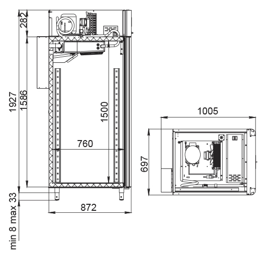 Каталог оборудования Холодильное оборудованиеШкафы холодильныеСпециализированные холодильные шкафыШкаф холодильный для вызревания сыра Polair CS107 Cheese полки нерж. Шкаф холодильный для вызревания сыра Polair CS107 Cheese полки нерж. Код товара: 062-628 Поделиться: WhatsAppTelegram СравнитьДобавить в КПВ избранное 0 391 000 ₽ В корзину 0 шт Под заказСамовывоз сегодня бесплатно Взять в кредит Купить в лизинг Получить консультацию в WhatsApp Описание Характеристики Отзывы 0 Инструкции 5 Шкаф холодильный для вызревания сыра Polair CS107 Cheese полки нерж. предназначен для создания оптимальных условий хранения и дозревания твердых и полутвердых сыров на предприятиях общественного питания и торговли. Монолитный цельнозаливной корпус выполнен из нержавеющей стали снаружи и изнутри (кроме задней стенки), что обеспечивает высокую механическую прочность и долговечность шкафа. Оборудование рассчитано на работу при температуре окружающей среды до 40 °С. Особенности: Верхнее расположение агрегата Многофункциональная русифицированная контрольная панель с 5-дюймовым дисплеем Возможность создания и сохранения собственных программ в памяти электронного блока Четыре перфорированные полки из нержавеющей стали Встроенный ультразвуковой увлажнитель (требуется подключение к системе подачи очищенной воды и централизованной канализации) Распашная дверь с заливной теплоизоляцией Заменяемый уплотнитель двери с магнитной вставкой Встроенная ручка для удобства открытия Отключаемая внутренняя LED-подсветка Штампованное углубление в дне корпуса для облегчения ухода Надежный замок Педаль для бесконтактного открывания двери Регулировка уровня влажности от 60% до 95% Максимальная нагрузка на каждую полку — 40 кг Толщина стенок корпуса — 43 мм Polair CS107 Cheese полки нерж. — это современный и надежный холодильный шкаф, который обеспечивает идеальные условия для хранения и дозревания твердых и полутвердых сыров. Прочный корпус, точное управление влажностью и температурой, а также удобство эксплуатации делают его отличным решением для предприятий общественного питания и торговли, стремящихся сохранить качество и вкусовые свойства сырной продукции.Изображение товара, представленного на фото, может отличаться от его фактического вида. Показать все Габаритные размеры697×1005×1960 ммДиапазон рабочей температурыот -2 до +30 °CДлина697 ммШирина1005 ммВысота1960 ммОбъём700 лКол-во дверей1 Тип двериМеталлическая Количество полок4 штДопустимая нагрузка на полку40 кгУровень влажностиот 60 до 95 %Холодильный агрегатВстроенный Тип оттайкиАвтоматическая Тип охлажденияДинамическое ПодсветкаЕсть ХладагентR290 Вес нетто144 кгВес брутто171 кгБрендPolairВсе специализированные холодильные шкафы Из нержавейки Оставить отзыв Еще никто не оставил отзыв на этот товар Схема POLAIR CS107 Cheese.jpgИнструкция на POLAIR CS107 Cheese.pdfБрошюра на POLAIR CS107 Cheese.pdfДекларация о соответствии.pdfСертификат соответствия.pdf Похожие товары Перейти в каталог Под заказ 405 450 ₽ Шкаф холодильный для хлебопекарных производств Polair CS107 Bakery Br черный, со стеклом (Тип 1) Под заказ 402 050 ₽ Шкаф холодильный для вызревания мяса Polair CS107 Meat со стеклом (Тип 2) Под заказ 264 448 ₽ Шкаф холодильный для вызревания мяса и сыра Carboma M700GN-1-G-MHC 0430 Под заказ 397 800 ₽ Шкаф холодильный для вызревания сыра Polair CS107 Cheese полки нерж., со стеклом Под заказ 373 915 ₽ Шкаф холодильный для вызревания 
