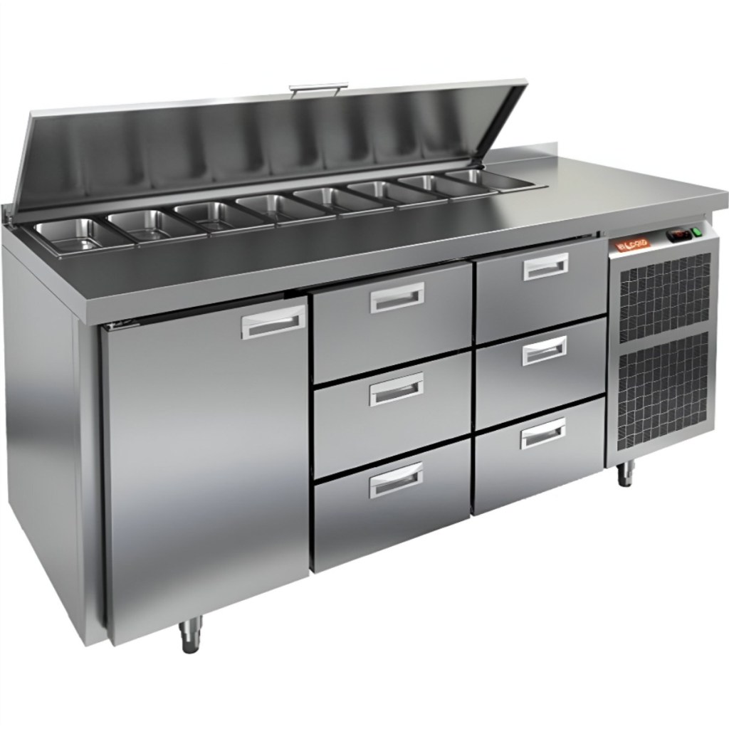 Каталог оборудования Холодильное оборудованиеСтолы охлаждаемыеСтолы холодильные для салатовСтол холодильный для салатов HiCold SL1-133GN (1/3) с крышкой Стол холодильный для салатов HiCold SL1-133GN (1/3) с крышкой Код товара: 064-848 Поделиться: WhatsAppTelegram СравнитьДобавить в КПВ избранное 0 209 962 ₽ В корзину 0 шт Под заказСамовывоз сегодня бесплатно Взять в кредит Купить в лизинг Получить консультацию в WhatsApp Описание Характеристики Отзывы 0 Стол холодильный для салатов HiCold SL1-133GN (1/3) предназначен для использования на предприятиях общественного питания и торговли. Он объединяет рабочую поверхность и охлаждаемый отсек, что делает его удобным решением для хранения, охлаждения и подготовки ингредиентов при приготовлении салатов, пиццы и других блюд. Такая конструкция позволяет повару работать быстрее и эффективнее, так как все необходимые продукты находятся под рукой. Корпус и столешница выполнены из прочной нержавеющей стали, устойчивой к коррозии и легко поддающейся санитарной обработке. Металлическая крышка защищает продукты от загрязнений и сохраняет их свежесть. Особенности модели: Электронная панель управления — точная настройка температурного режима. 1 глухая дверь — удобный доступ к холодильному отсеку. 6 выдвижных ящика — быстрое размещение и замена продуктов. Вместимость салат-бара — до 8 гастроемкостей глубиной до 100 мм. Автоматические доводчики дверей с фиксацией в открытом положении. Легкозаменяемые магнитные уплотнители — надежная герметичность. Открытая агрегатная часть — быстрый доступ для обслуживания. Регулируемые по высоте ножки — устойчивость даже на неровном полу. Толщина столешницы, борта и теплоизоляции — 50 мм, что обеспечивает прочность и энергоэффективность конструкции. HiCold SL1-133GN (1/3) — практичное и удобное решение для профессиональной кухни, обеспечивающее удобную подготовку и хранение ингредиентов. Изображение товара, представленного на фото, может отличаться от его фактического вида. Показать все Габаритные размеры1835×700×850 ммДиапазон рабочей температурыот +2 до +10 °CРасположение агрегатаБоковое Материал столешницыНержавеющая Тип столаС дверьми и ящиками Тип двериГлухая Объём505 лКоличество дверей1 штТип гастроемкостейGN 1/3 Количество ящиков6 штРазмер полки530×325 ммНапряжение220 ВМощность0,46 кВтТип охлажденияДинамическое Тип оттайкиАвтоматическая СтолешницаС бортом Габариты в упаковке2000×850×1000 ммВес нетто130 кгВес брутто185 кгБрендHicold Оставить отзыв Еще никто не оставил отзыв на этот товар Ранее просмотрено Под заказ 174 952 ₽ Стол холодильный для салатов HiCold SLE2-111GN (1/6) О З М с крышкой Под заказ 140 482 ₽ Стол холодильный для салатов HiCold SL2-11GN (1/6) О без крышки Под заказ 170 901 ₽ Стол холодильный для салатов HiCold SLE3-111GN полипропилен, без крышки Под заказ 204 921 ₽ Стол холодильный для салатов HiCold SL1-22GN (1/3) О с крышкой Под заказ 143 722 ₽ Стол холодильный для салатов HiCold SL1-11GN (1/3) О с крышкой