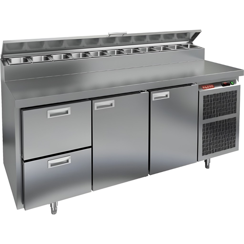 Стол холодильный для пиццы HiCold PZ2-211/GN (1/6H) предназначен для кухонь и предприятий общественного питания. Он используется для раскатки теста, подготовки ингредиентов для пиццы, салатов и других блюд, а также для охлаждения и кратковременного хранения скоропортящихся продуктов. Модель совмещает нержавеющую рабочую поверхность и охлаждаемый отсек с 2 дверями и 2 выдвижными ящиками, обеспечивая удобный доступ к ингредиентам и эффективное хранение.